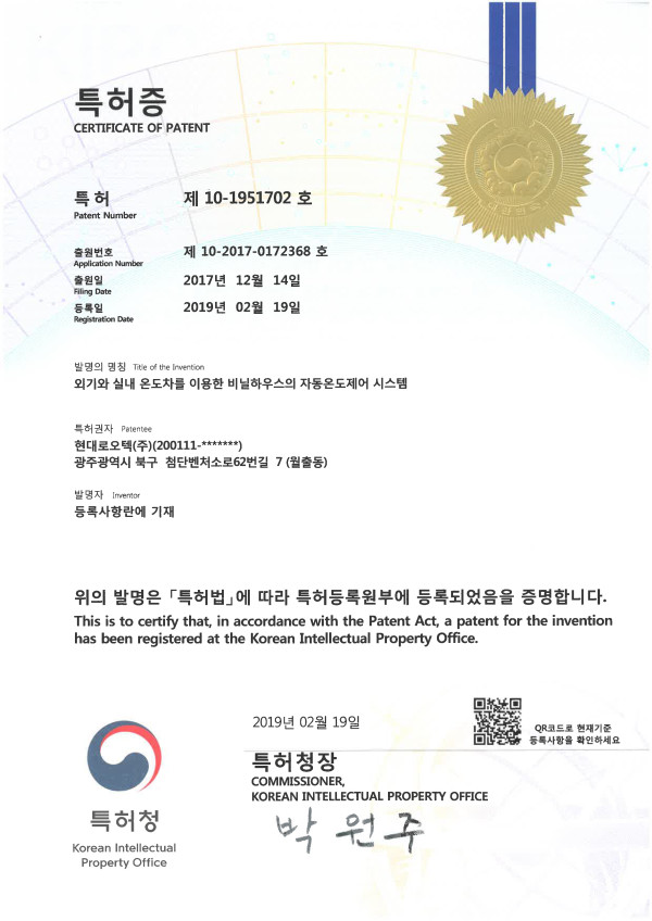 외기와 실내 온도차를 이용한 비닐하우스의 자동온도제어 시스템 특허 > 산업재산권현황