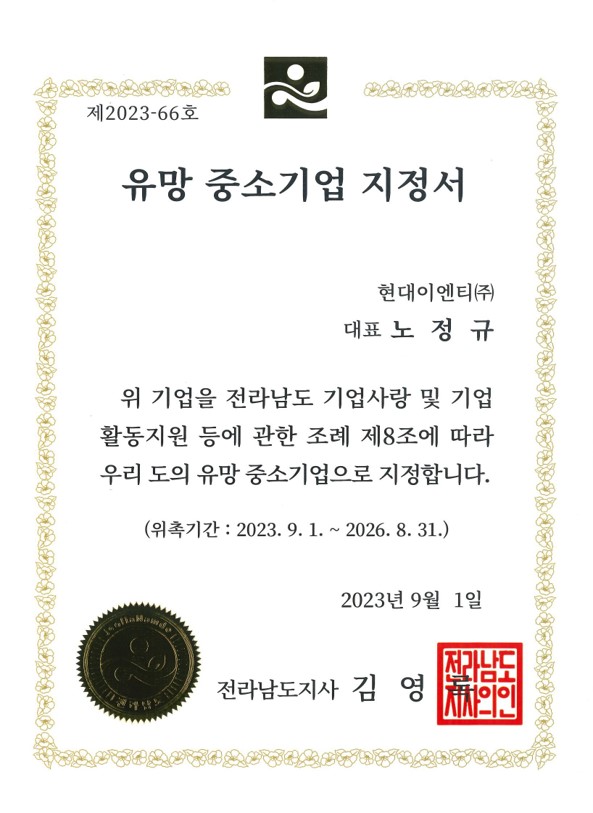유망 중소기업 지정서