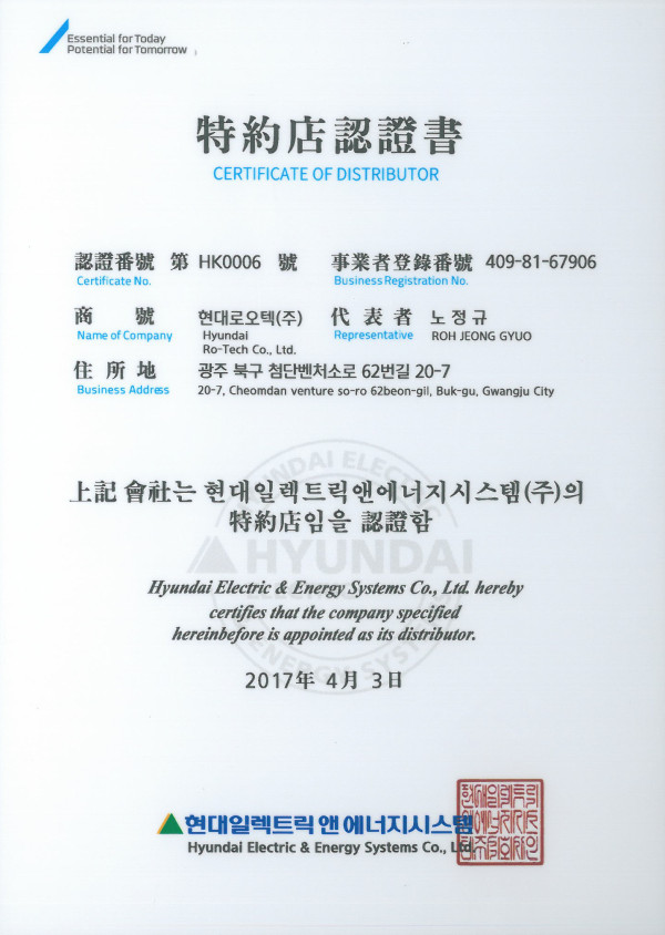 일렉트릭 앤 에너지 특약점 인증서 > 인증서